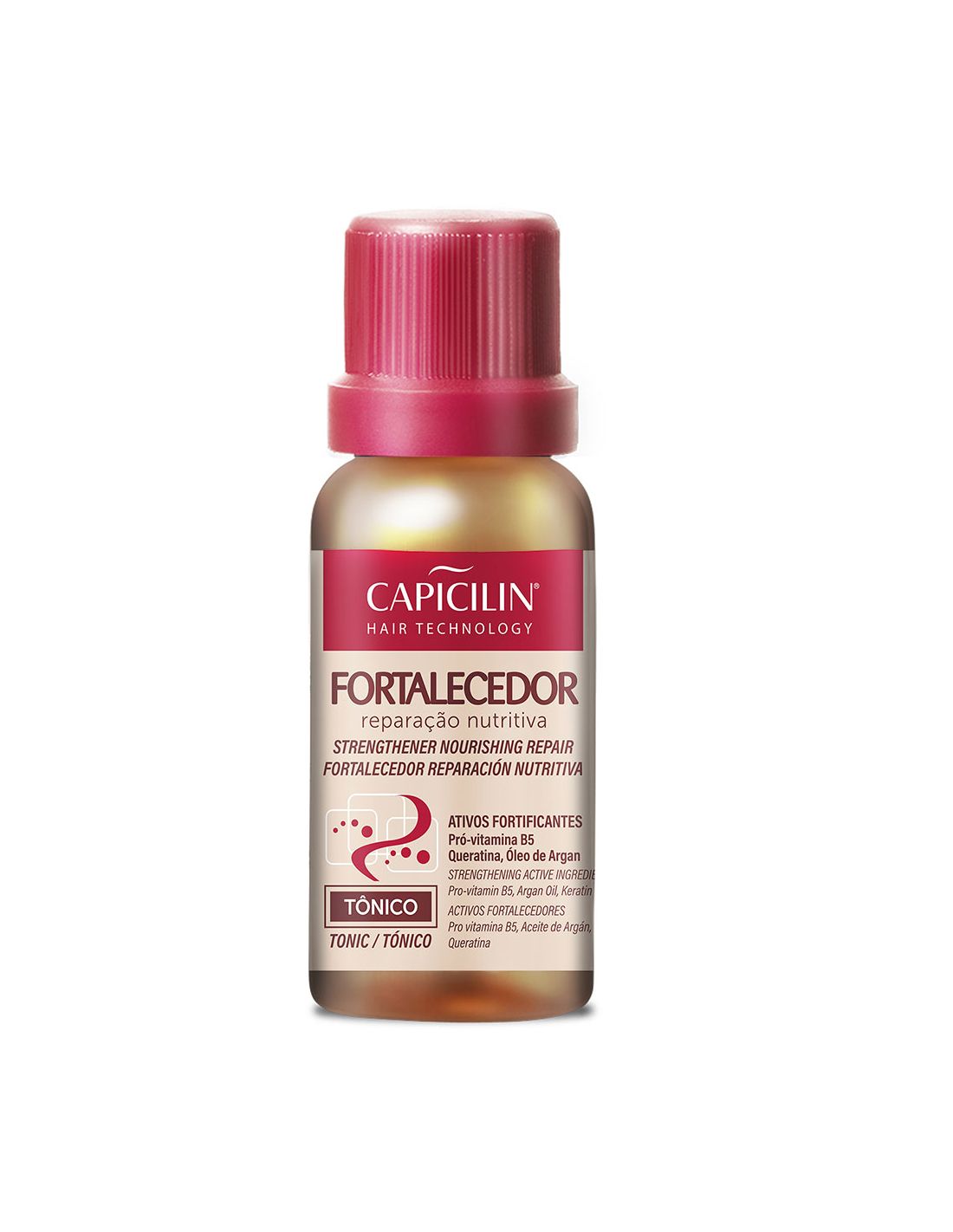 Tónico Capilar Fortalecedor de 20ml, formulado com óleo de argan, queratina e pró-vitamina B5.