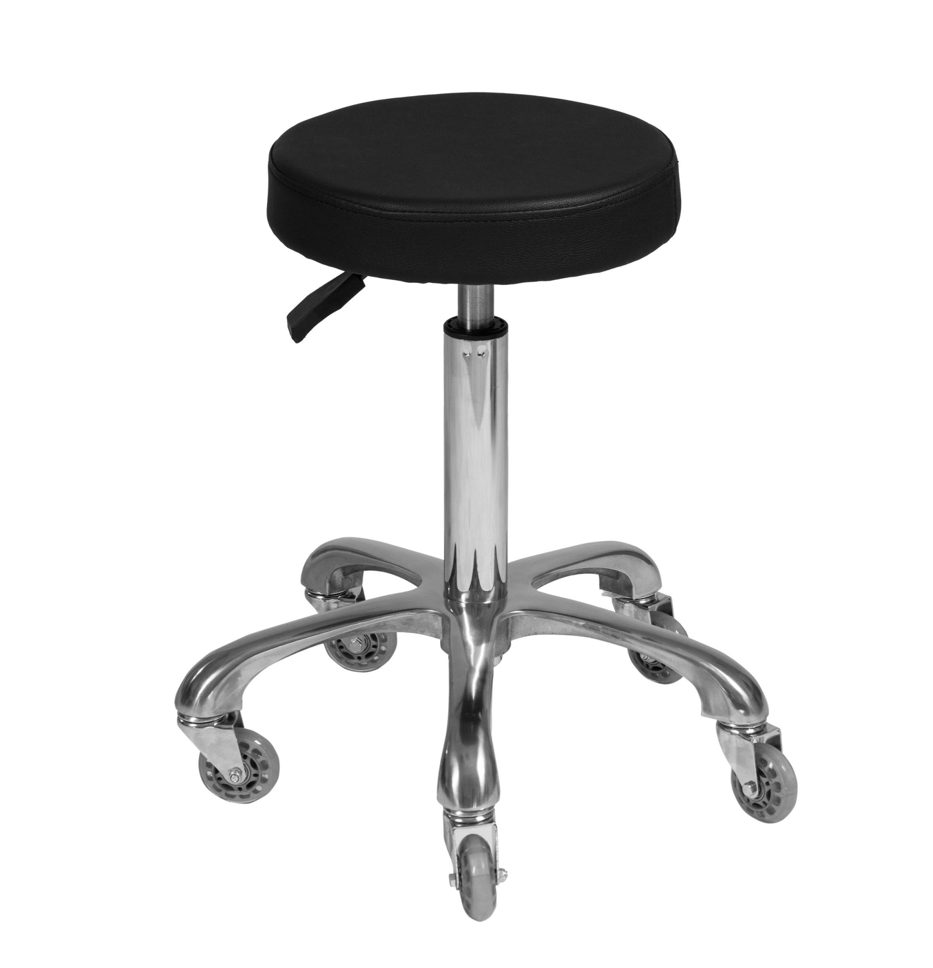 Banco com base metálica, altura ajustável com pistão a gás, 5 rodas e assento redondo, garantindo estabilidade e mobilidade.