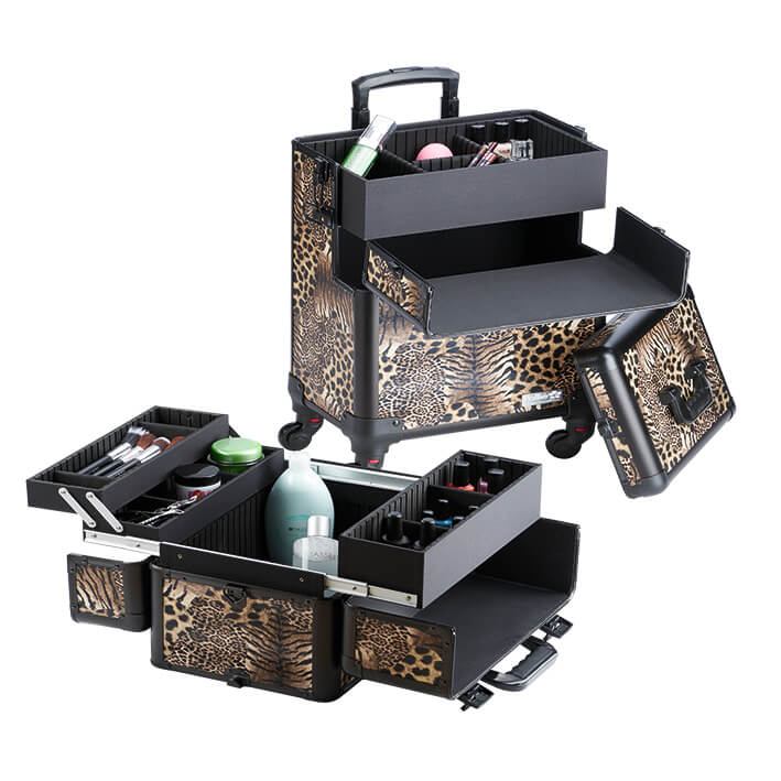 Mala 2 em 1 com quatro corpos. A nova mala Pollié nos permite armazenar qualquer produto de cabeleireiro, maquiagem ou cosmética. A parte superior possui 3 bandejas removíveis com 9 compartimentos e 4 no interior que podem ser modificados, movendo os divisores. Os dois corpos superiores podem ser separados e usados como uma mala de mão. A mala vem com uma alça de ombro. Os dois corpos inferiores podem ser convertidos em uma mala com rodas, com apenas dois corpos. A tampa desta mala tem um espelho embutido. Nesta seção, há uma bandeja removível com 4 compartimentos que podem ser modificados graças aos divisores. As rodas são intercambiáveis. Inclui duas chaves sobressalentes.