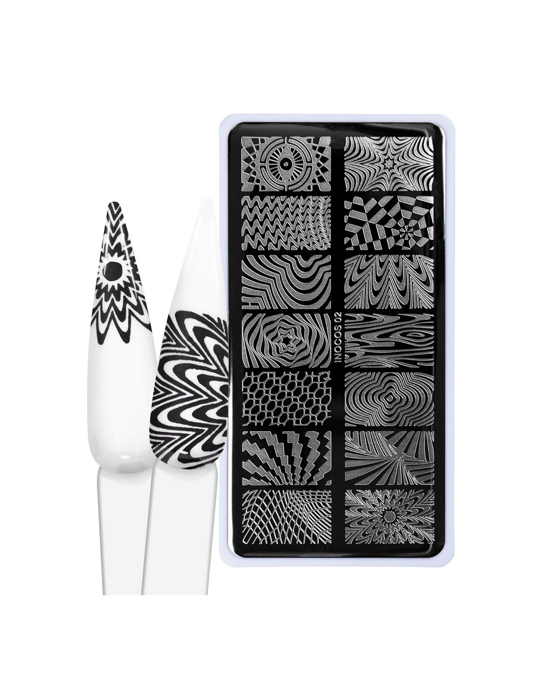 Placa em aço inoxidável com gravuras de padrões diversos para a técnica de nail art stamping.