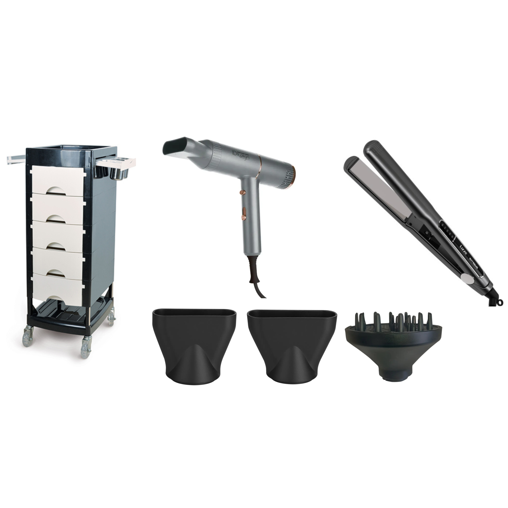 - Carrinho prático com rodas silenciosas, 5 gavetas removíveis, bandeja superior com compartimentos e suporte de secador.