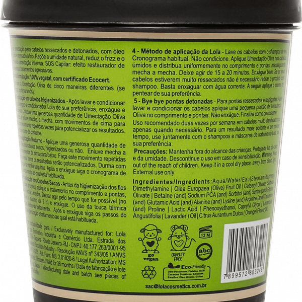 Pode ser aplicado em cabelos limpos e húmidos, de uso noturno, em cabelos secos, como uma máscara e nas pontas danificadas. Uso recomendado 2 vezes por semana em cabelos muito danificados ou apenas quando necessário. Para obtenção de melhores resultados, utilizar juntamente com shampoos e máscaras de tratamento LOLA à sua escolha.