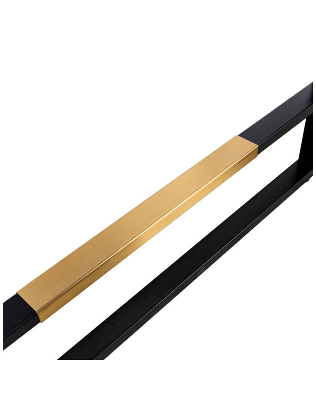 Com gaveta de metal e barra de pousa-pés em aço inoxidável dourado.