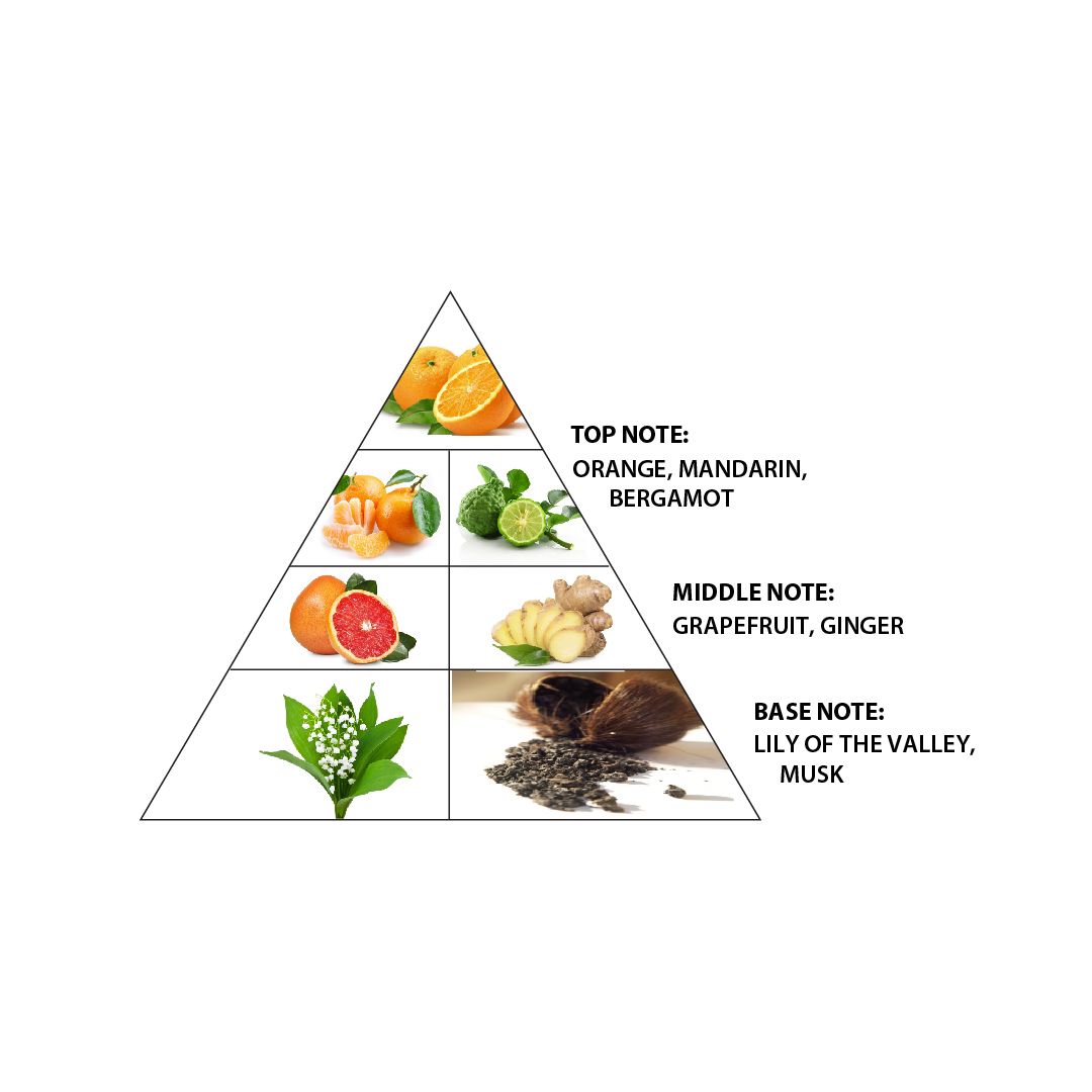 A abertura é vibrante e energizante, com cítricos suculentos que despertam os sentidos instantaneamente. No coração, a fragrância revela um equilíbrio refinado entre a nobreza da íris, o toque levemente picante do gengibre e a vivacidade da toranja, criando uma assinatura olfativa moderna e elegante. O fundo é suave, confortável e envolvente, com notas limpas e almiscaradas que prolongam a sensação de frescor e pureza na pele.