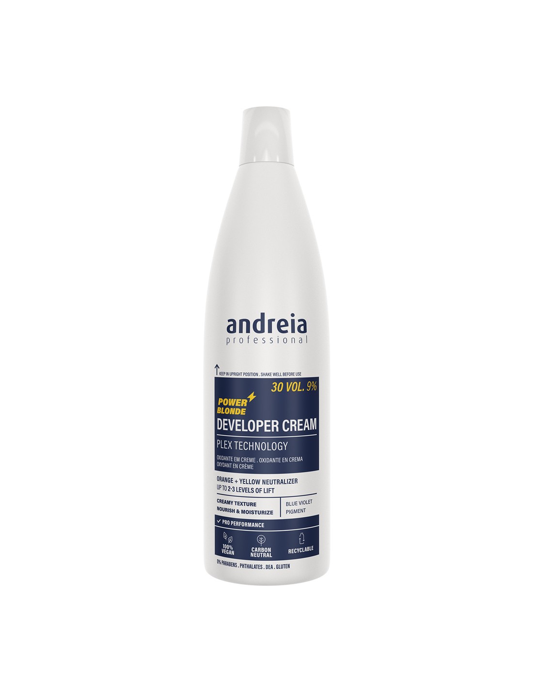 Oxidante 30 vol. (9%) 2-3 níveis de aclaramento. Com textura cremosa, hidrata e nutre os cabelos graças à tecnologia plex. Contém pigmento azul violeta para neutralização dos tons alaranjados e amarelados. Adequado a todos os tipos de cabelo. Potencializa a ação da coloração e descoloração power blonde. Performance profissional. 0% Parabenos, Ftalatos, DEA, Glúten.