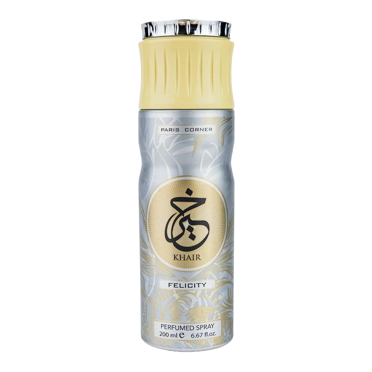 O Paris Corner Khair Felicity Deodorant 200ml é um desodorizante perfumado que proporciona frescura duradoura e uma fragrância elegante e envolvente. Ideal para uso diário, ajuda a neutralizar odores enquanto deixa um aroma delicado e agradável na pele.