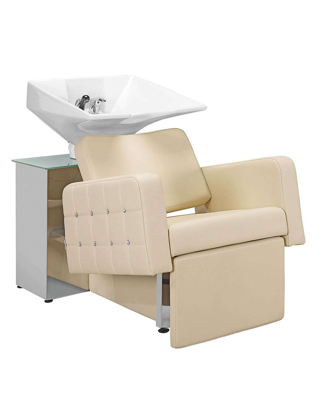 Móvel em inox polido, com louça funda branca e exterior dos braços com botões diamante.