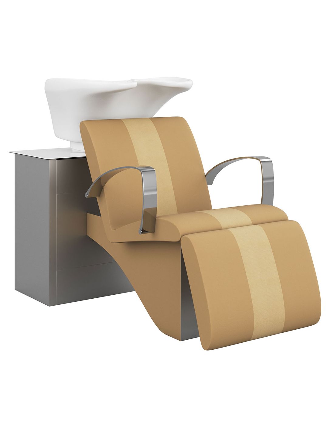Móvel de lavagem com estrutura em Inox polido, espuma de alta densidade, prateleira interior e braços em alumínio e poliamida.