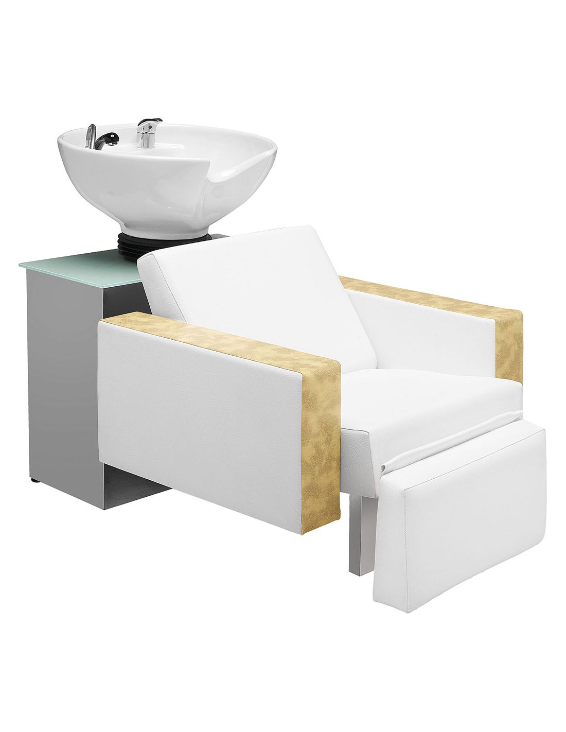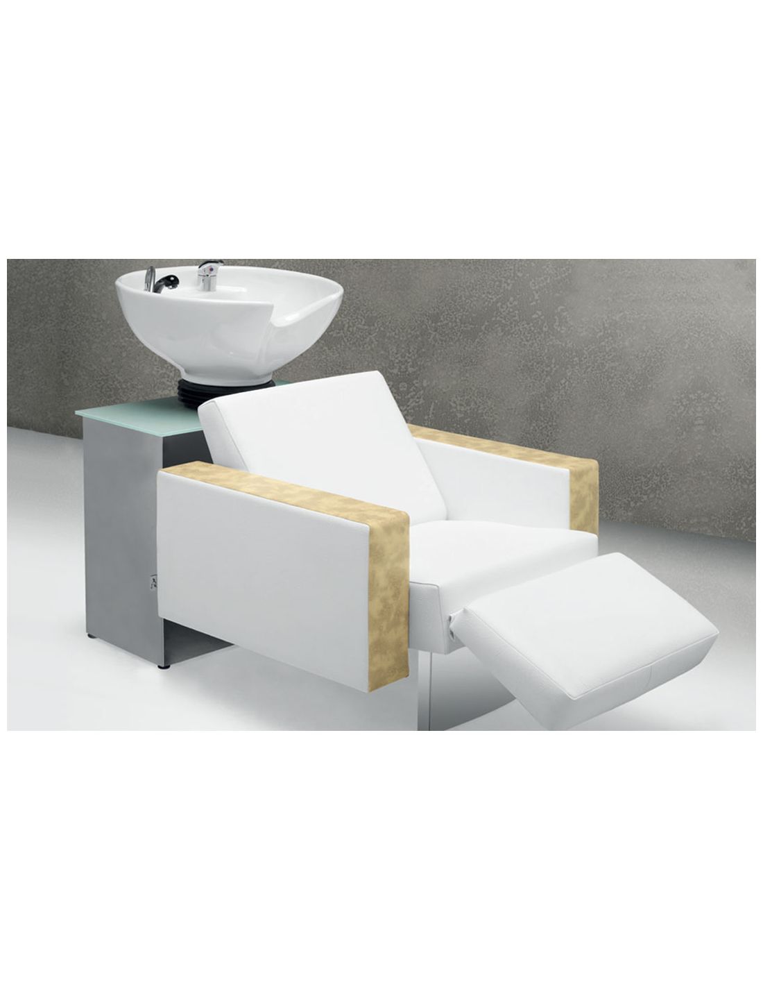Móvel de lavagem com louça funda branca, estrutura em inox polido com espuma de alta densidade.