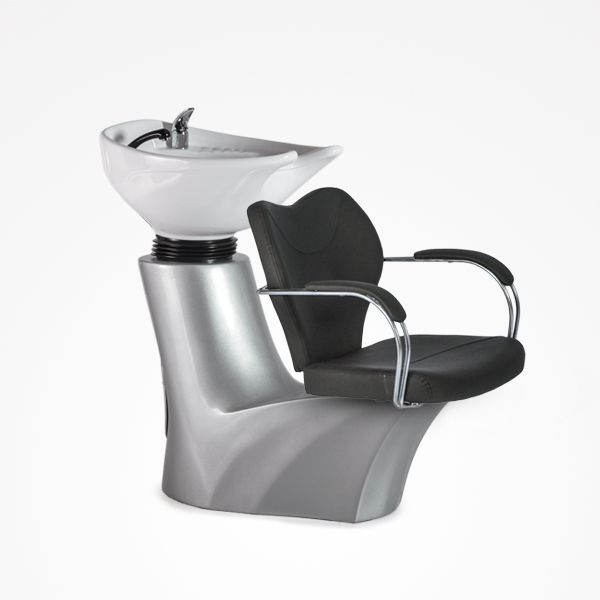 Rampa de lavagem profissional Nicole Neil, com bacia de cerâmica reclinável em branco e torneiras de alavanca única italiana. Poltrona estofada em preto.