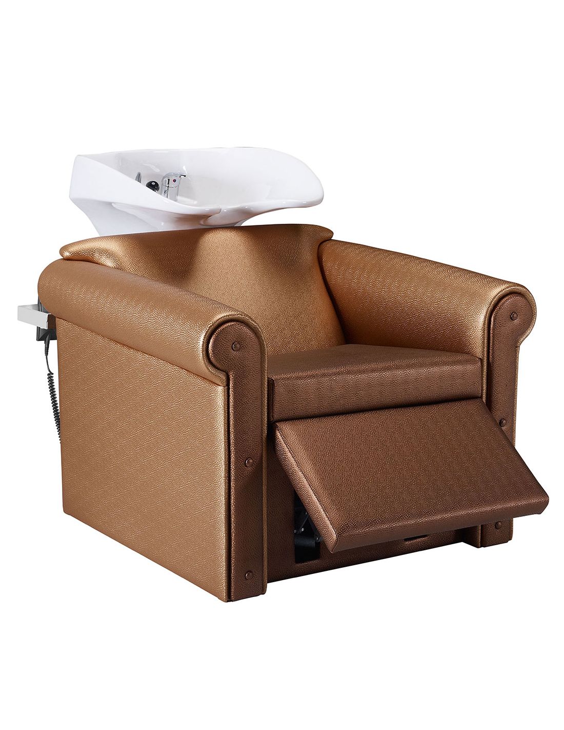 Rampa de Lavagem Prestige para cabeleireiro com sistema de elevação elétrico de pousa-pés e com sistema anti-drop incorporado.