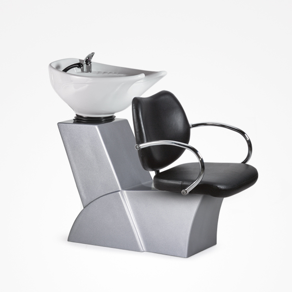 Rampa de lavagem profissional Volga Perth, com bacia de cerâmica reclinável em branco e torneiras de alavanca única italiana. Poltrona estofada em preto.