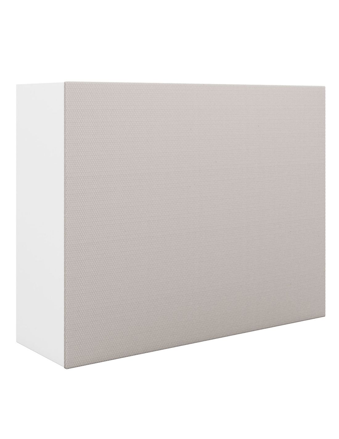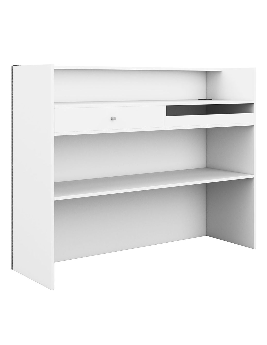 Balcão de recepção Bolt Privé em laminado branco standard com painel frontal forrado.