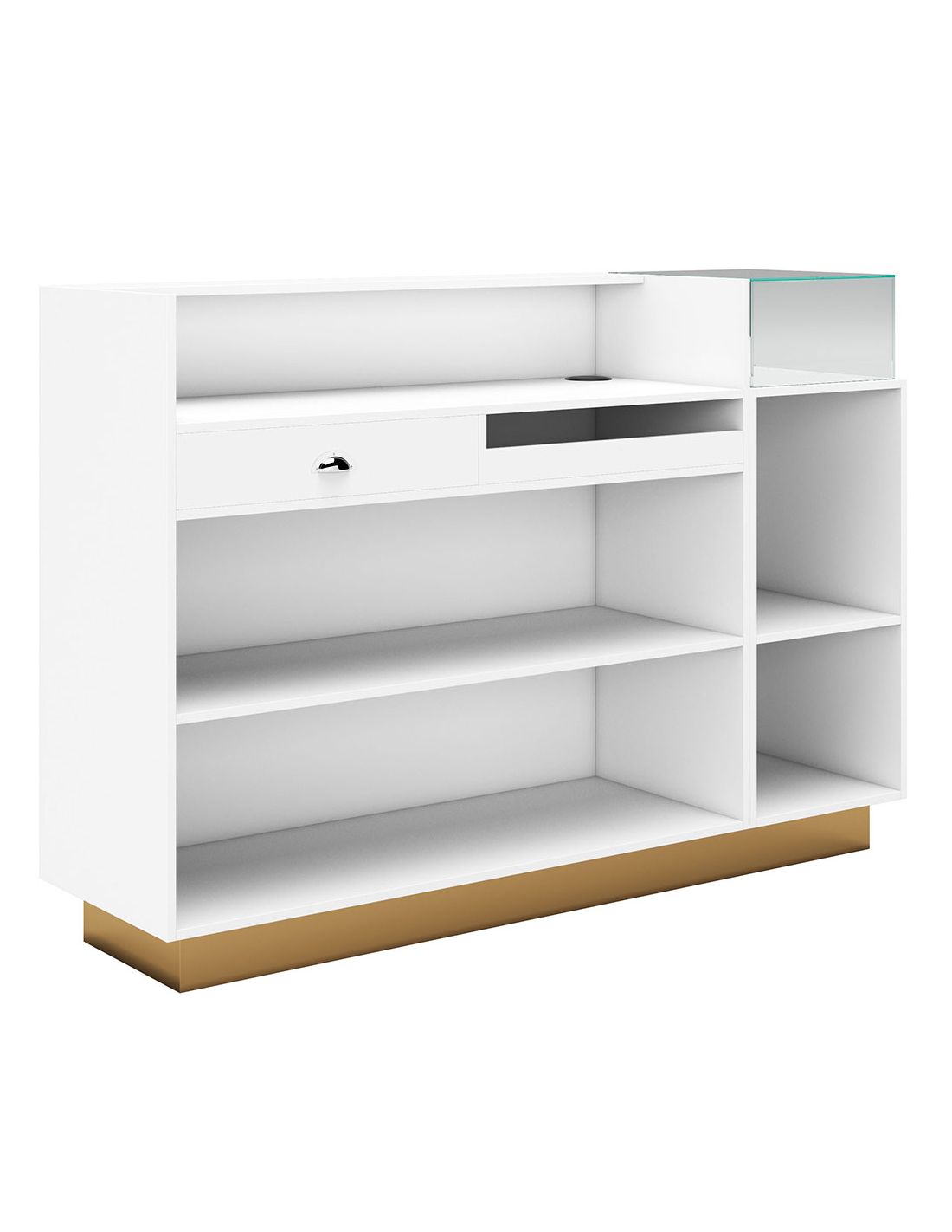 Balcão de receção Galeone Gold em laminado branco standard com painel frontal forrado.