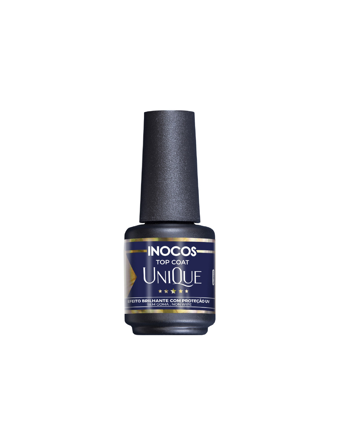 Top Coat Inocos Unique para dar efeito brilho, sem goma e com proteção UV.