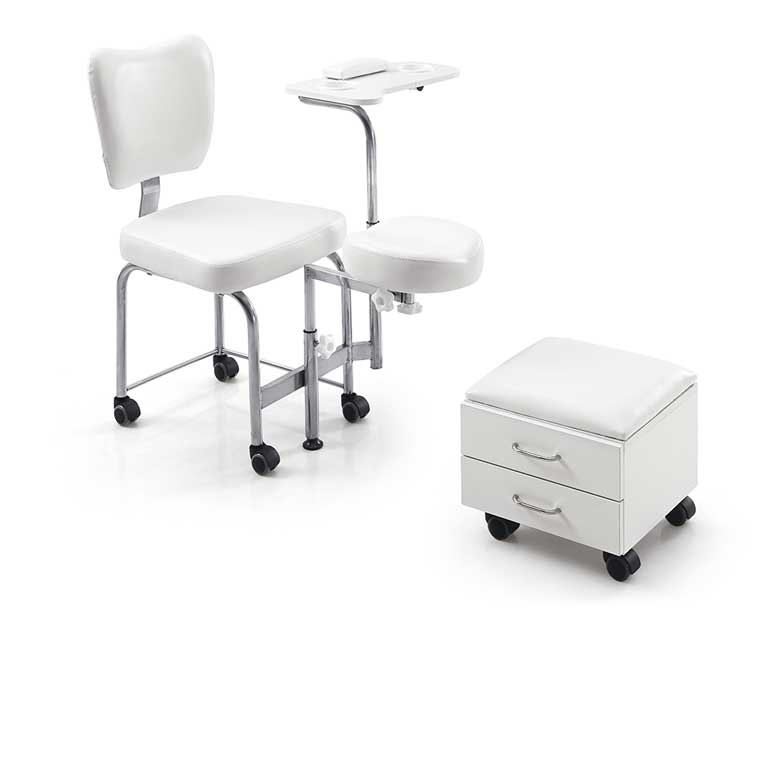 É equipado com suporte lateral giratório com apoio de mão e apoio de pés ajustável.