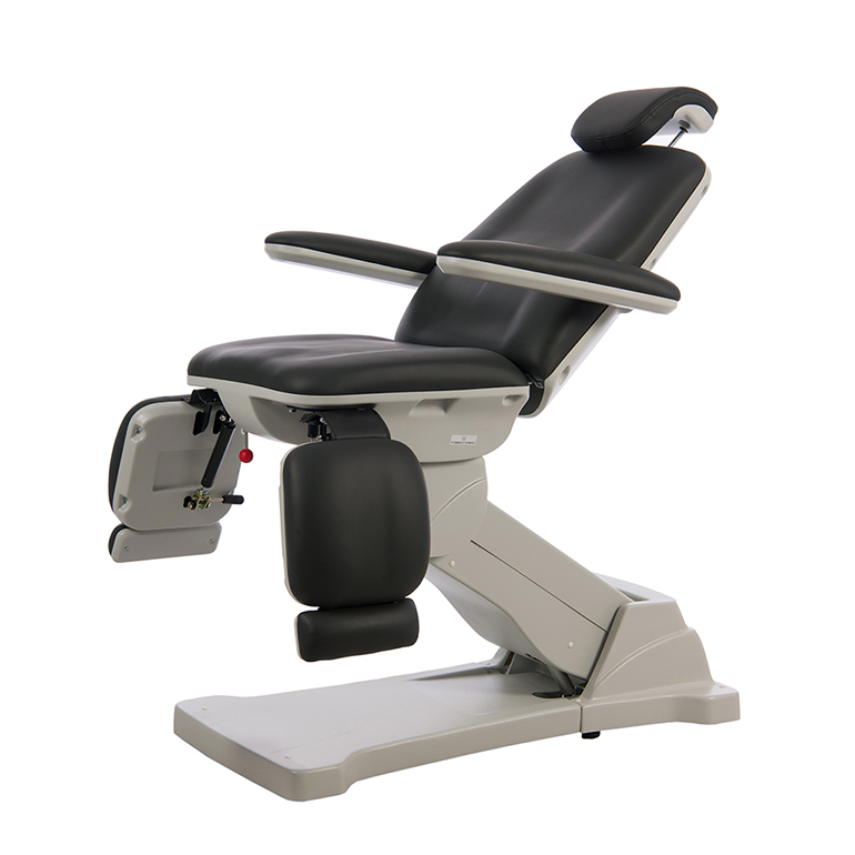 Cadeira de podologia equipada com 3 motores que controlam a altura, o encosto e a inclinação do assento.