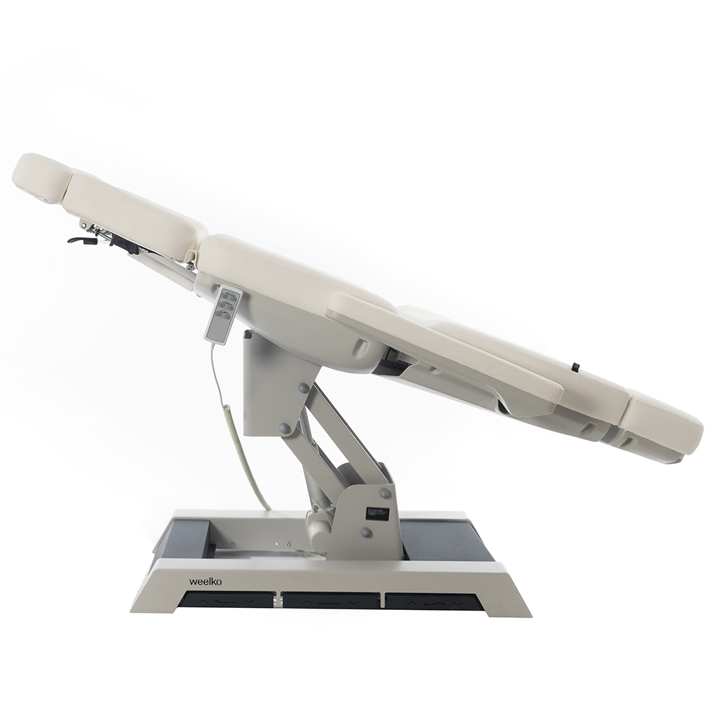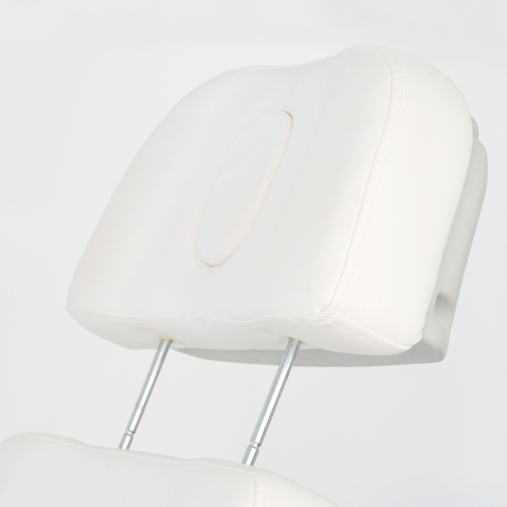 Cadeira de beleza de luxo equipada com 3 motores que controlam a altura, o encosto e a inclinação do assento. Os motores podem ser ajustados pelos pedais integrados na base ou pelo controlador manual incluso. Apoios de braço reclináveis e almofada do encosto de cabeça ajustáveis em várias posições fixas. Legrest é ajustável por gas lift. Estofado em PU branco de alta qualidade que facilita a limpeza.