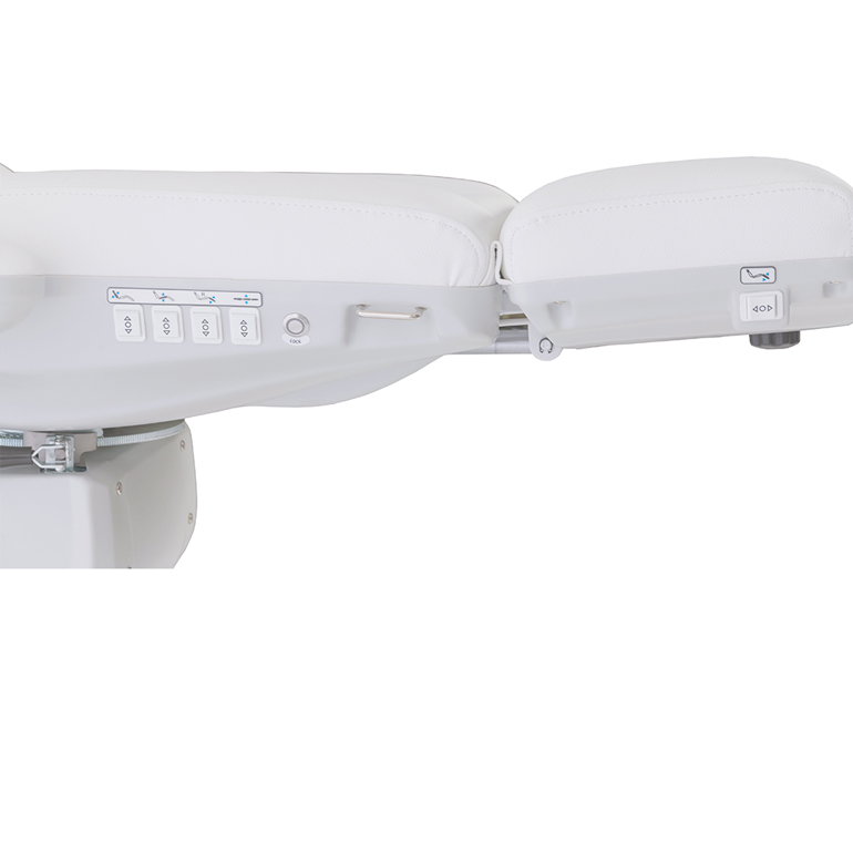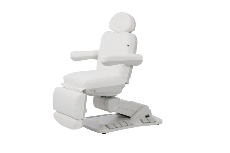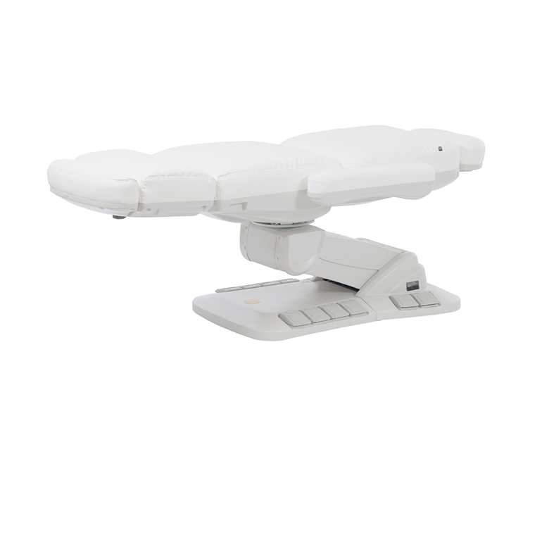 Cadeira de beleza de luxo com estrutura muito estável especialmente desenhada para otimizar o espaço de trabalho graças à sua rotação de 90 °. 4 motores controlam a altura, encosto, inclinação do assento e do apoio para os pés. Apoios de braços reclináveis. Os painéis de botões e o controlador de pedal embutido permitem um controle completo de todas as funções de qualquer ponto da cadeira. Sistema de bloqueio de segurança incluído. Esta versão inclui a função RESET para trazer a cadeira de volta à posição zero. Acolchoado ultrasoft de alto conforto com estofamento em PU branco de alta qualidade.