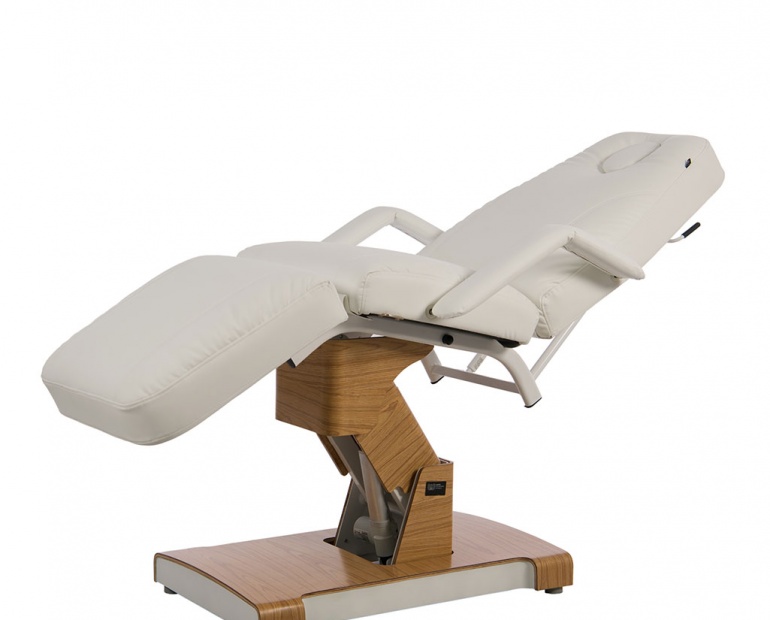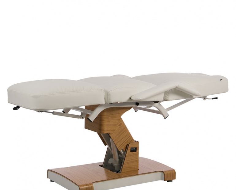 Marquesa de 3 secções de grande estabilidade. Equipada com 2 motores que controlam a altura e inclinação do assento. Inclinação do encosto e apoio de pernas ajustável por elevação a gás. Apoios de braço removíveis e orifício facial. Acolchoamento ultrasoft de alto conforto com estofo em PVC branco de alta qualidade.