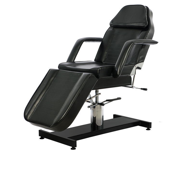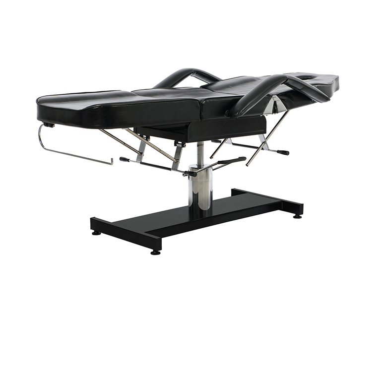 Marquesa funcional de 3 secções com estrutura metálica pintada, equipada com bomba hidráulica que controla a altura. A inclinação do encosto e do apoio de pernas é ajustável manualmente. Apoios de braço removíveis. Estofo em PVC branco fácil de limpar.