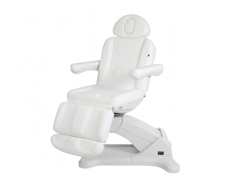 Marquesa de beleza de luxo Tempo com estrutura muito estável e de alto conforto. Especialmente projetado para otimizar o espaço de trabalho graças à sua rotação de 240°. Com 3 motores que controlam a altura, o encosto e a inclinação do assento. Apoio para os pés ajustável por bomba de gás, braços reclináveis e apoio de cabeça ajustável. Os painéis de botões embutidos no encosto, o apoio de pernas e o assento permitem um controle completo de todas as funções de qualquer ponto da cadeira. Esta versão inclui a função RESET para trazer a cadeira de volta à posição zero. Estofo em PU branco de alta qualidade que facilita a limpeza.