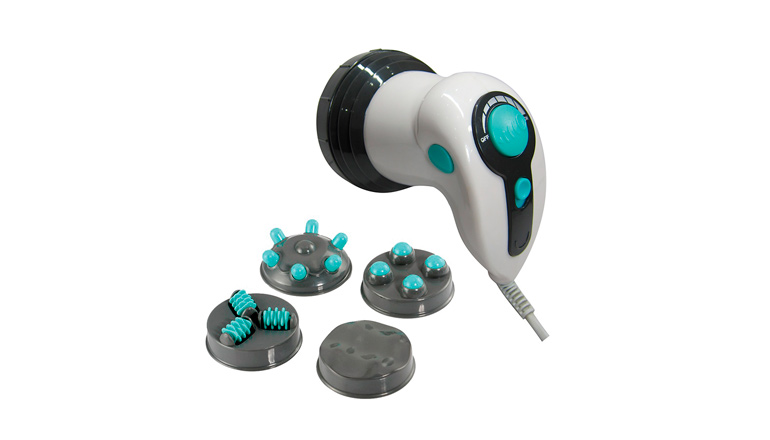 Massageador portátil anticelulite. É equipado com 4 cabeças intercambiáveis para diferentes tipos de massagem e uma luz infravermelha. Intensidade ajustável.