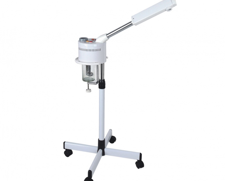 Vaporizador de Ozono Sky com revestimento de metal em branco. Equipado com temporizador e cabeça rotativa. Altura ajustável e base estável com rodas para facilitar o movimento.